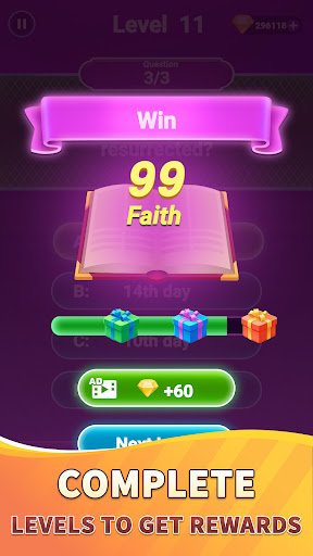 هل أنت مستعد لتحدي معرفتك وتعزيز فهمك للإيمان المسيحي؟ استمتع بألعاب Bible Trivia و Bible Quiz ذات المستويات! تم تصميم Bible Trivia لاختبار معرفتك بالكتاب المقدس ومعرفة المزيد عنه بطريقة ممتعة. من خلال اختبارات الكتاب المقدس اليومية، يمكنك تدريب عقلك وتوسيع فهمك للعهدين القديم والجديد، مع تعلم المزيد عن القصص الغنية في الكتاب المقدس. Bible Trivia